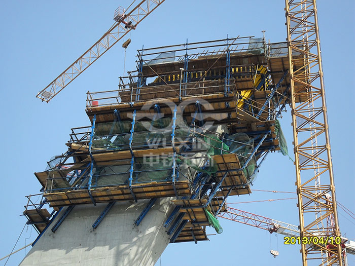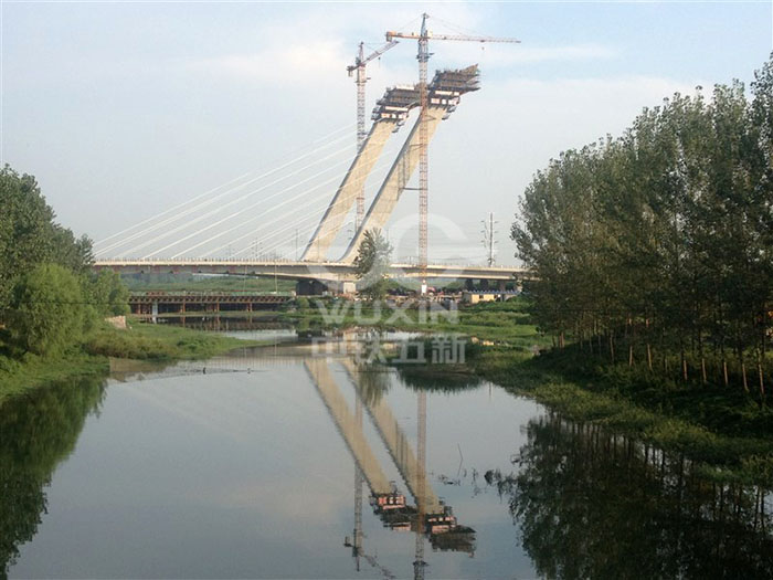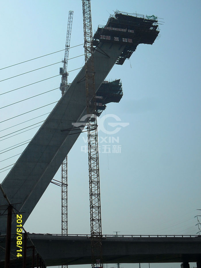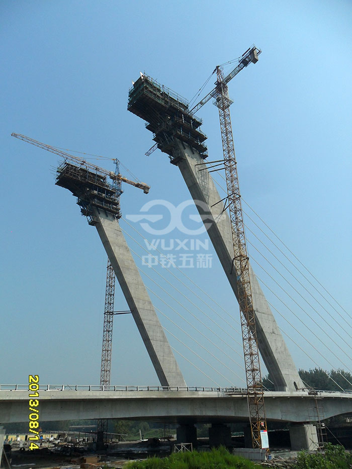 工程亮點或工程難點:主塔為獨柱式鋼筋混凝土斜塔,傾斜角30°,主橋為4跨無背索斜拉橋
