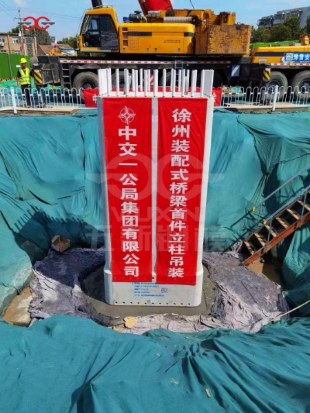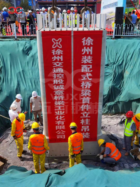 徐州交控誠意橋梁公司生產的第一個預制墩身成功對接中交一公局海威公司施工的徐州解放北路第一個承臺,無縫對接。